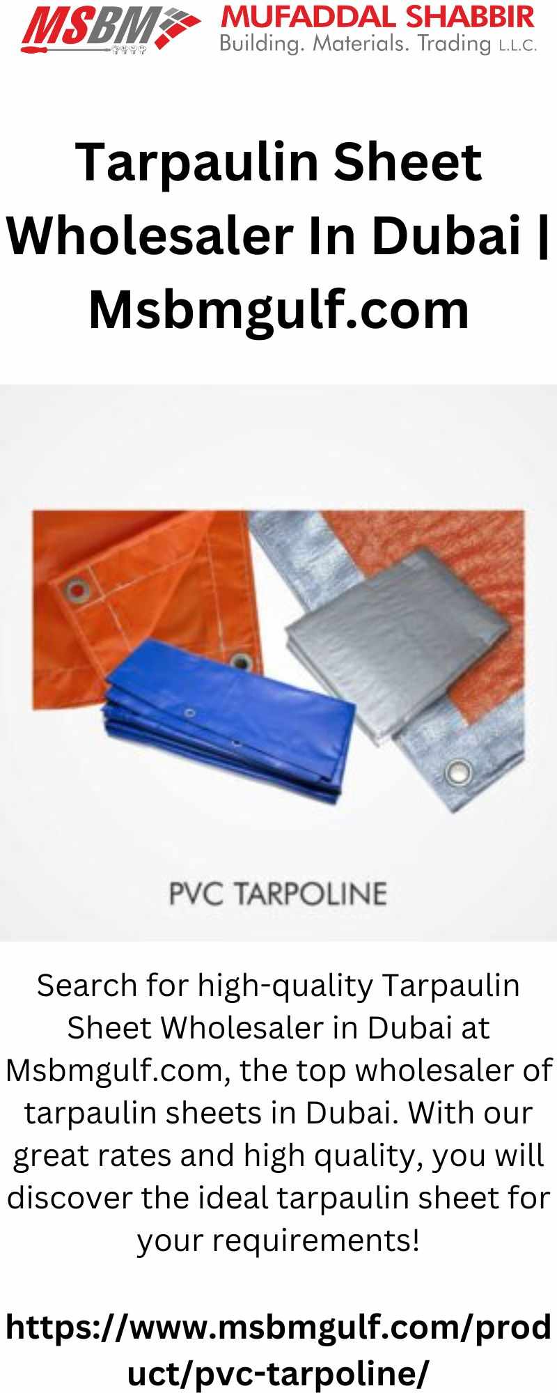 Search for high-quality Tarpaulin Sheet Wholesaler in Dubai at Msbmgulf.com, the top wholesaler of tarpaulin sheets in Dubai. With our great rates and high quality, you will discover the ideal tarpaulin sheet for your requirements!